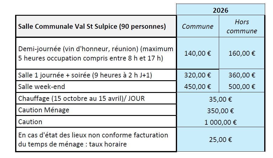 La salle communale du Val Saint Sulpice est de nouveau accessible à la location.